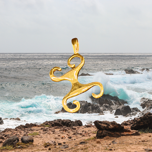 Ryon Dijkhoff, PENDANT INSPIRED BY ARUBA’S AMERINDIAN PICTOGRAPHS including stainless steel necklace, SILVER METAL WITH 24K GOLD PLATING, 2.5 X 2.5 CM, 2025